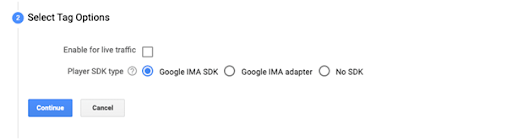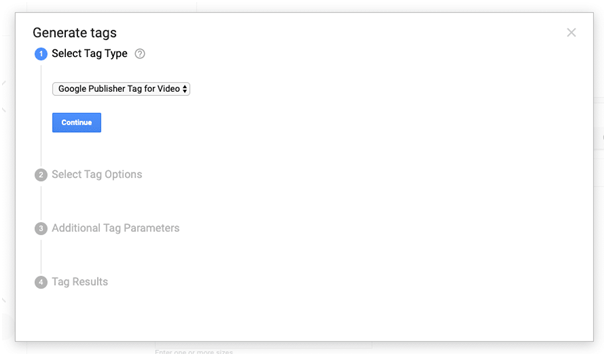 1. Choose tag type as “Google publisher tag for video” and click “Continue”.