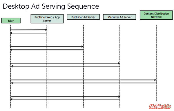 Referring to the desktop ad serving sequence above, you’ll notice that the client does the fetching and redirecting of information in the desktop environment.